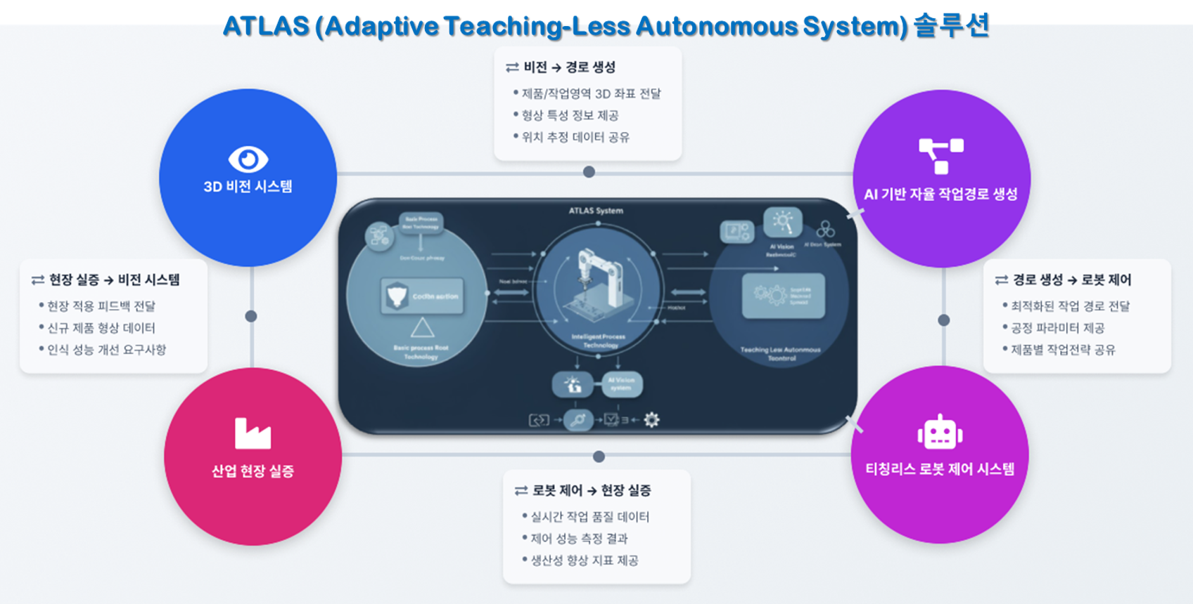 기반 공정 뿌리기술과 지능화 공정 뿌리기술을 융합한 차세대 공정기술인 AI비전 기반 티칭리스 자율제조 로봇기술 (ATLAS (Adaptive Teaching-Less Autonomous System) 솔루션) 개발 자동차 차체와 같이 면과 면의 연결이 유연하고 입체적인 구조물, 다품종 소량 생산, 복잡한 형상 등의 용접과 표면처리 및 도장 작업에서 사람에 의한 제한적이고 시간 소모적인 티칭으로 인한 로봇 자동화 도입의 한계 극복 분진 및 인화성 물질에 노출되는 고난도, 위험 환경의 무인화를 통한 작업자의 안전 확보, 효율적인 인력의 재배치 등을 통한 생산성 향상 실현 2곳 이상의 국내 로봇 모델을 대상으로 제조 현장 실증을 진행하여 국내 제품의 경쟁력 향상(자동차 부품, 선박건조 분야 우선 고려...